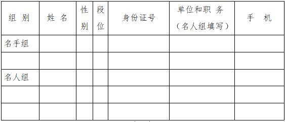 请各参赛选手务必使用统一下发的报名表(其中必填项目为:姓名、性别、组别、段位、身份证号、联系电话,无段请标注0)