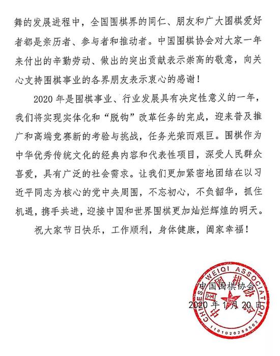 2019年,中国围棋事业和行业经历了深刻变革,呈现出蓬勃发展、去旧迎新、充满生机、欣欣向荣的喜人局面。我们坚持以习近平新时代中国特色社会主义思想为指导,认真贯彻体育强国战略和体育改革的总体部署,锐意进取,开拓创新,在推进协会实体化改革上迈出历史性步伐,在推动围棋由单一运动项目向“五业兴旺”转型上取得长足发展,在创新职业赛制、提升围棋竞技水平上屡创佳绩,在贯彻全民围棋战略、推动围棋进企业、进社区、进学校、进机关、进农村、进军营上取得重要进展,在加快中国围棋文化走出去、争取世界围棋发展的主导权、话语权上实现新突破,围棋正日益成为新时代人民美好生活的组成部分。在令人振奋和鼓舞的发展进程中,全国围棋界的同仁、朋友和广大围棋爱好者都是亲历者、参与者和推动者。中国围棋协会对大家一年来付出的辛勤劳动、做出的突出贡献表示崇高的敬意,向关心支持围棋事业的各界朋友表示衷心的感谢!